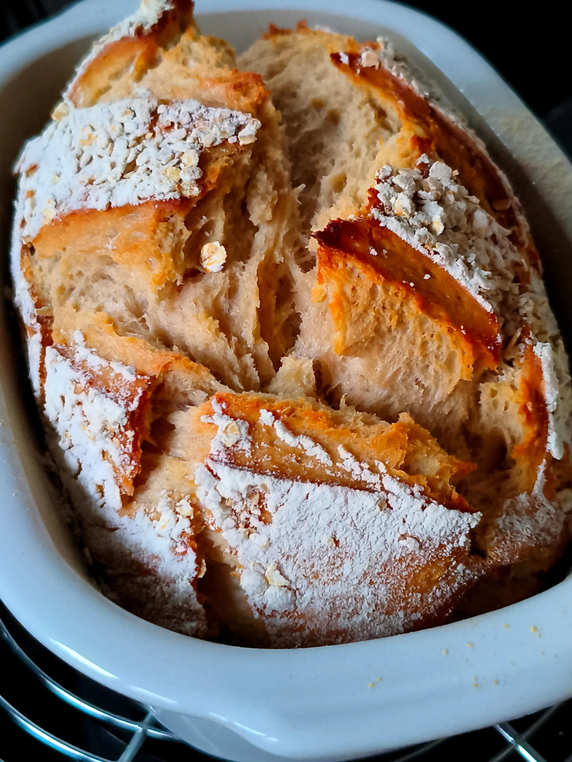 • Den Ofenmeister (Lily) fetten und bemehlen. Laib reinlegen und einritzen. Ein paar Haferflocken auf dem bemehlten Boden verteilen. Die Oberfläche etwas mit Wasser bnetzen und feine Haferflocken drüber streuen.